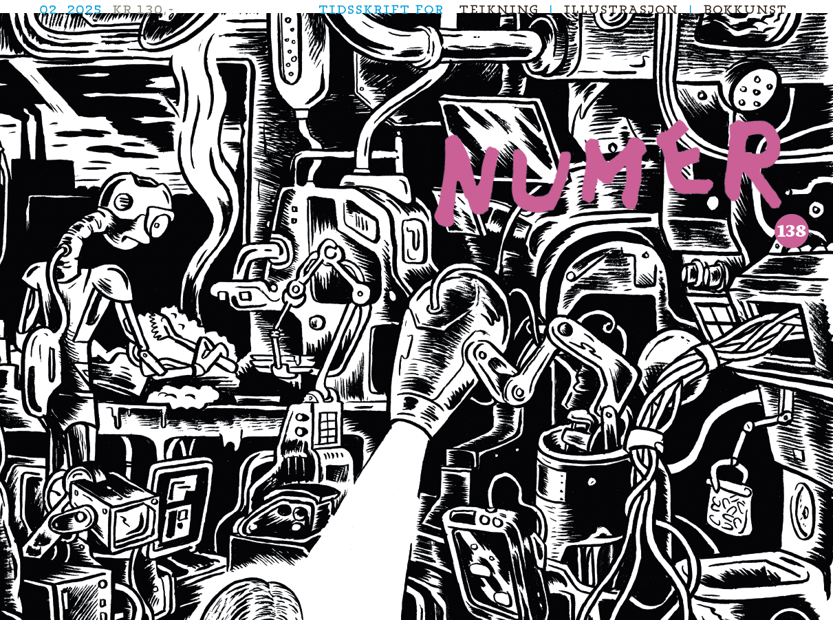 This is the big AI issue! Walter Wehus has interviewed cartoonist and artist Flu Hartberg about the fight against AI-generated images. Hartberg has also illustrated the cover with an exclusive drawing. NUMER -editor Fredrik Rysjedal gives you a status report on what is happening right now in the political landscape around AI-generated content , and Inger Marie Kjølstadmyr has created a survey about AI with illustrators Eivind Gulliksen, Eline Myklebust Madsen and Hilde Hodnefjeld.